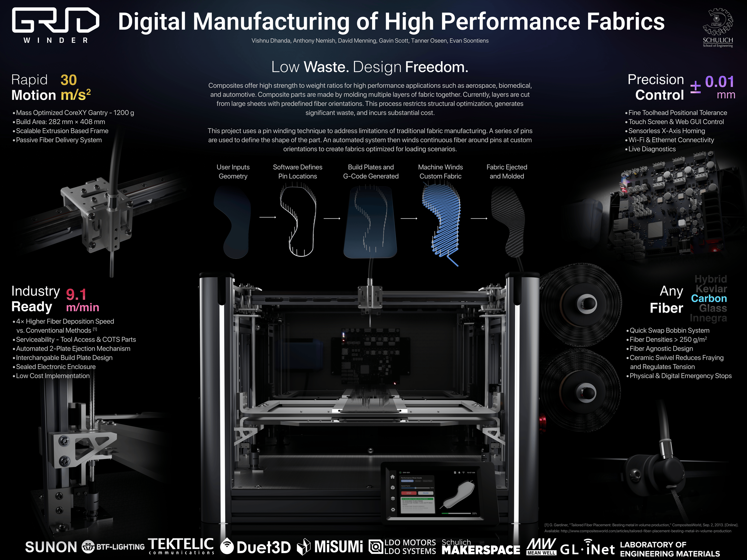 Currently, if a small-scale company or startup desires to create their own repeatable composite parts, they would need to outsource that production. This increases cost and reduces their already thin margins due to wasted material. The GridWinder is a scalable, affordable machine that runs on the common voltage found in homes and regular buildings, which can get any company up-and-running without the need for massive machines or retrofitted electrical systems.