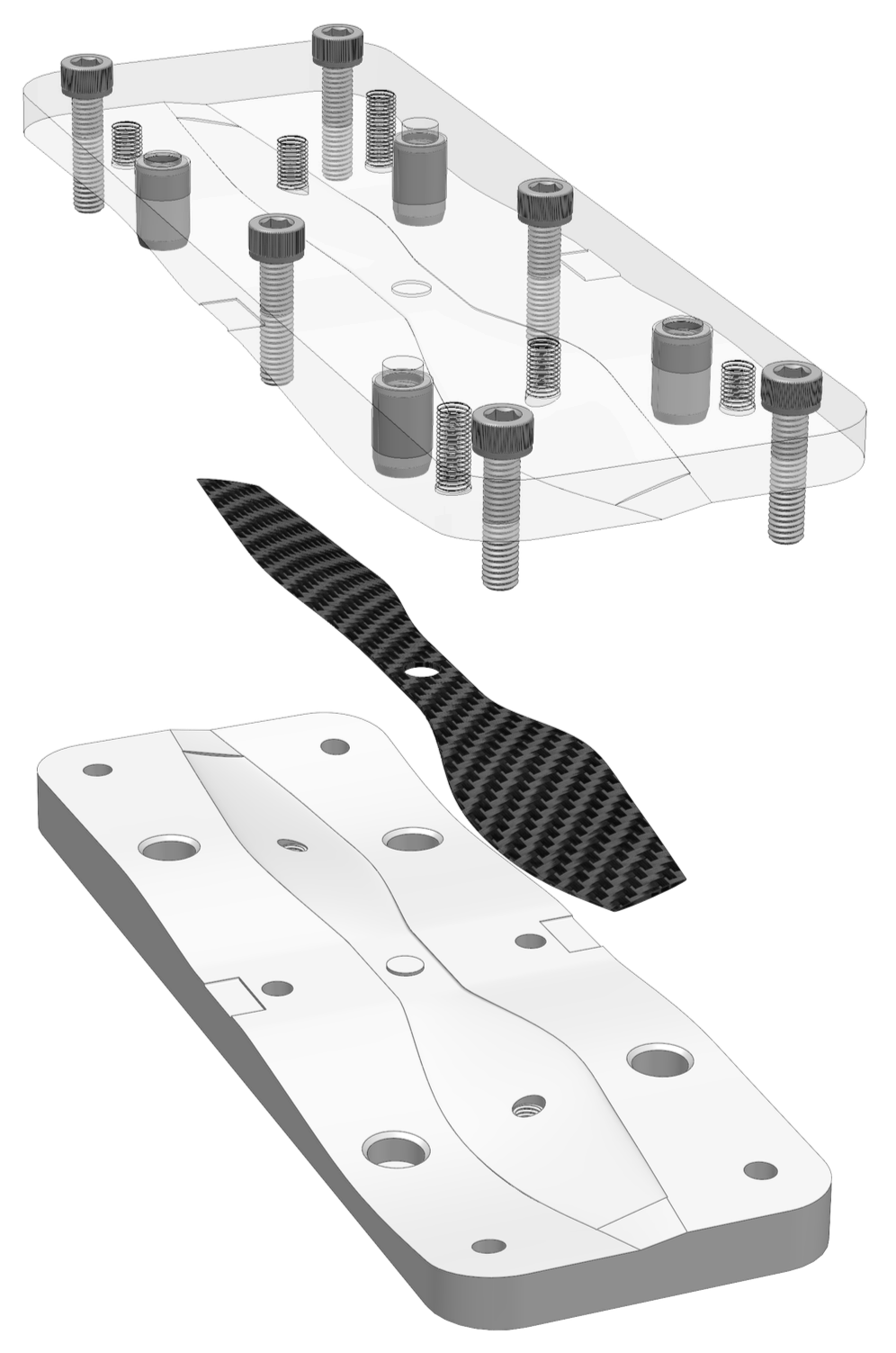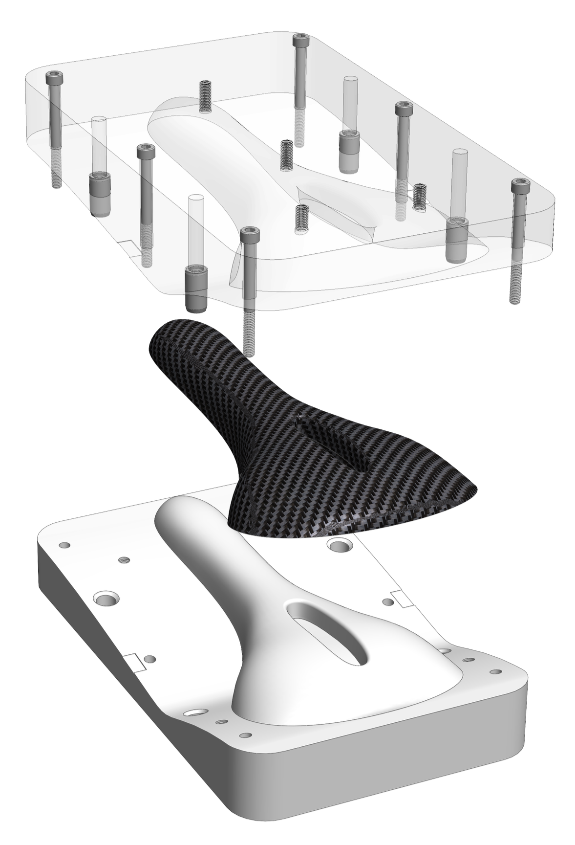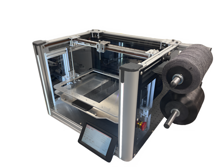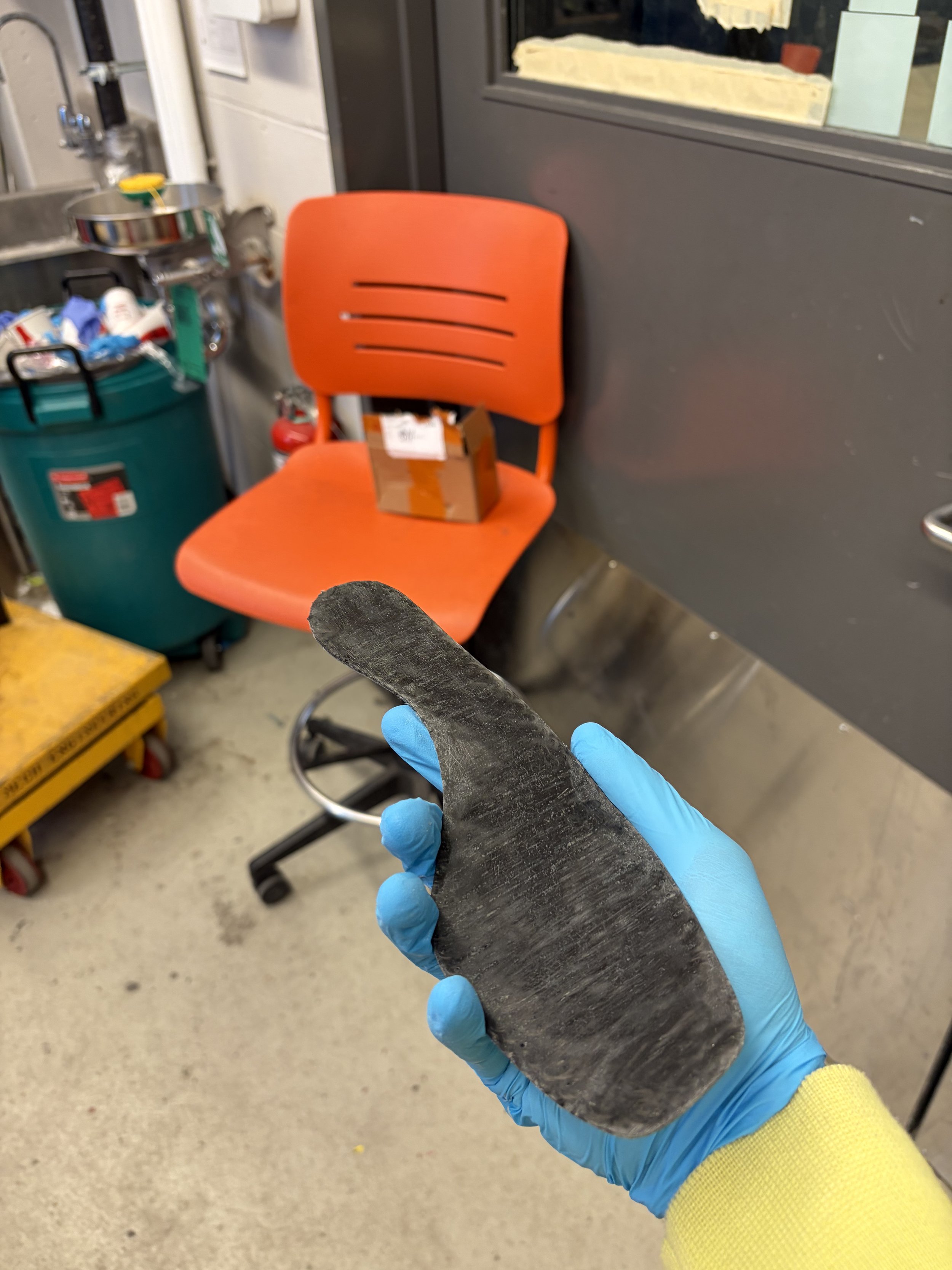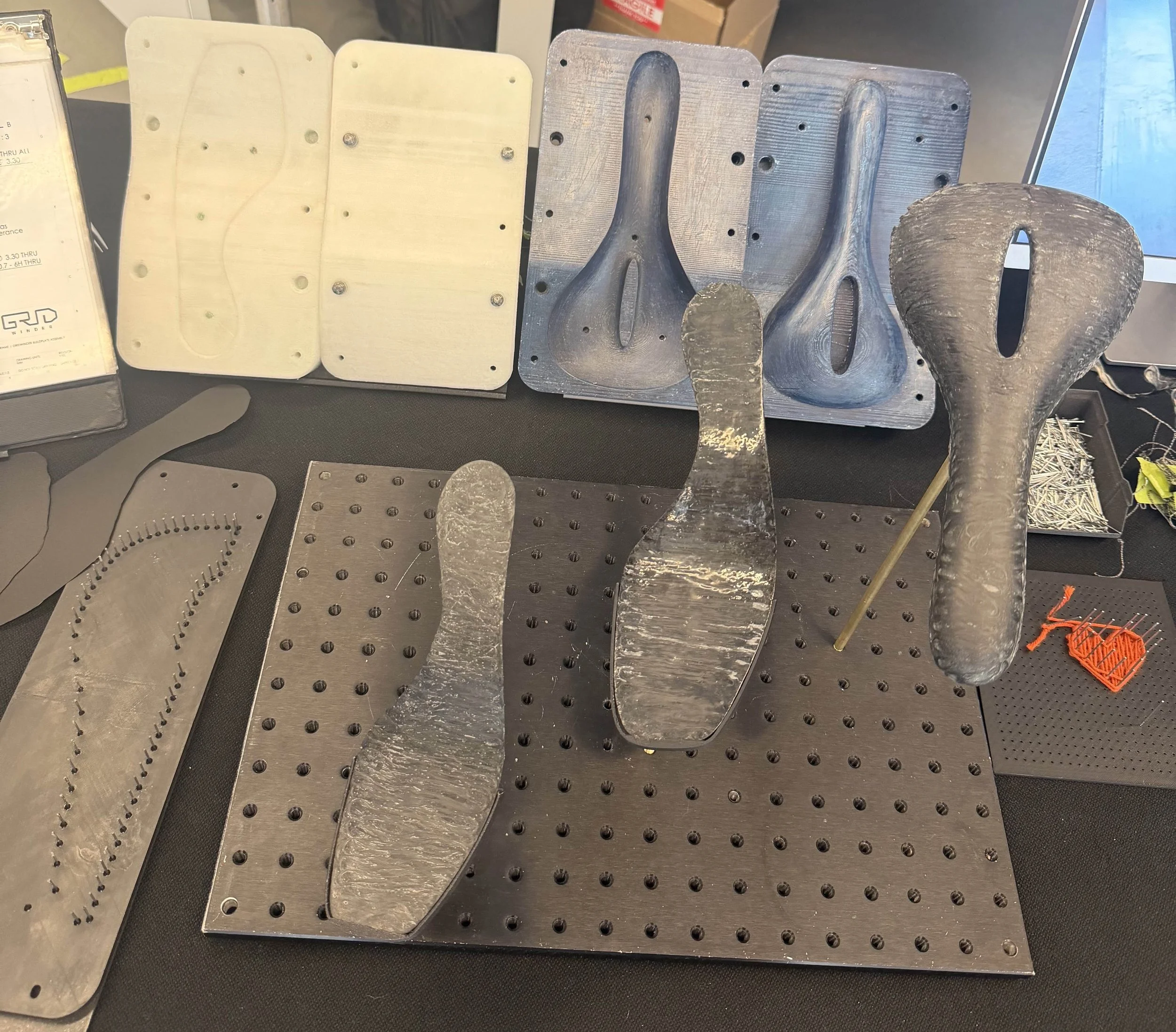 The three parts shown below are of a shoe midsole, bike seat, and drone propeller. Carbon fiber shoe midsoles are used in industry to give high performance running shoes extra stiffness, allowing for higher energy returns and therefore a faster shoe. Composite bike seats and propellers are commonly found on high performance race bikes and drones, as they provide an ideal ratio of strength to weight. We are investigating more use cases for this machine in the aerospace, automotive, and biomedical industries, and are specifically targeting shapes that are either already flat or easily drapable, as seen in these three examples.