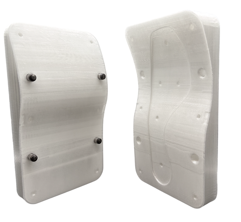 After the machine winds the fiber around the pins and ejects the fabric, it is ready for the molding process. This is done using a two-part 3D printed mold and epoxy resin. The mold has a layer of release wax applied to both sides of it, and then the epoxy resin, followed by a layer of the wound fabric, more epoxy, another wound fabric, and so on until the desired thickness of the part is reached. The mold is then clamped together and the resin is given time to cure.